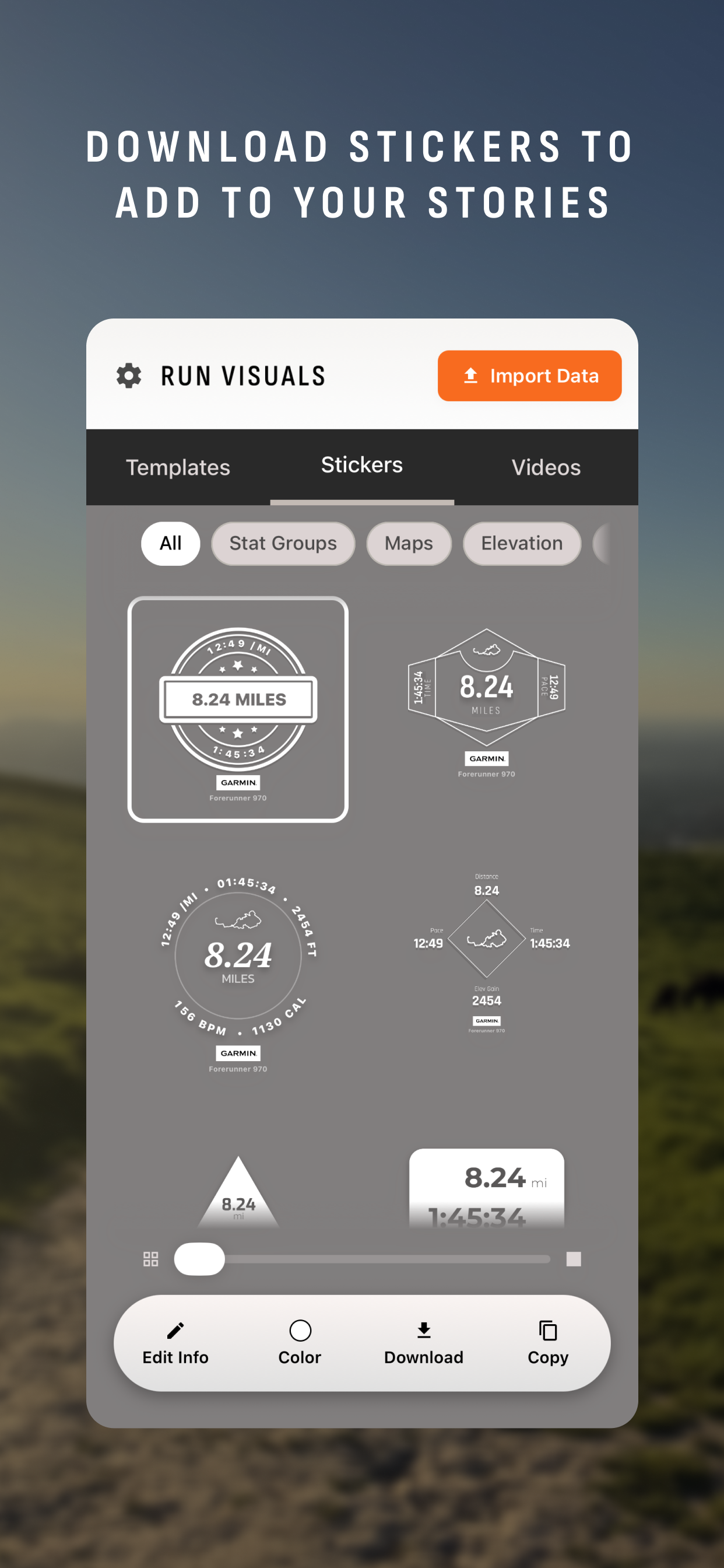 Run Visuals is an iOS and Android app that uses running data to create downloadable custom graphics, stickers and animated videos. It works with Strava, Garmin and Apple Health data. Build with Claude Code + VS Code, Figma MCP, React Native for the framework and AWS for the backend.